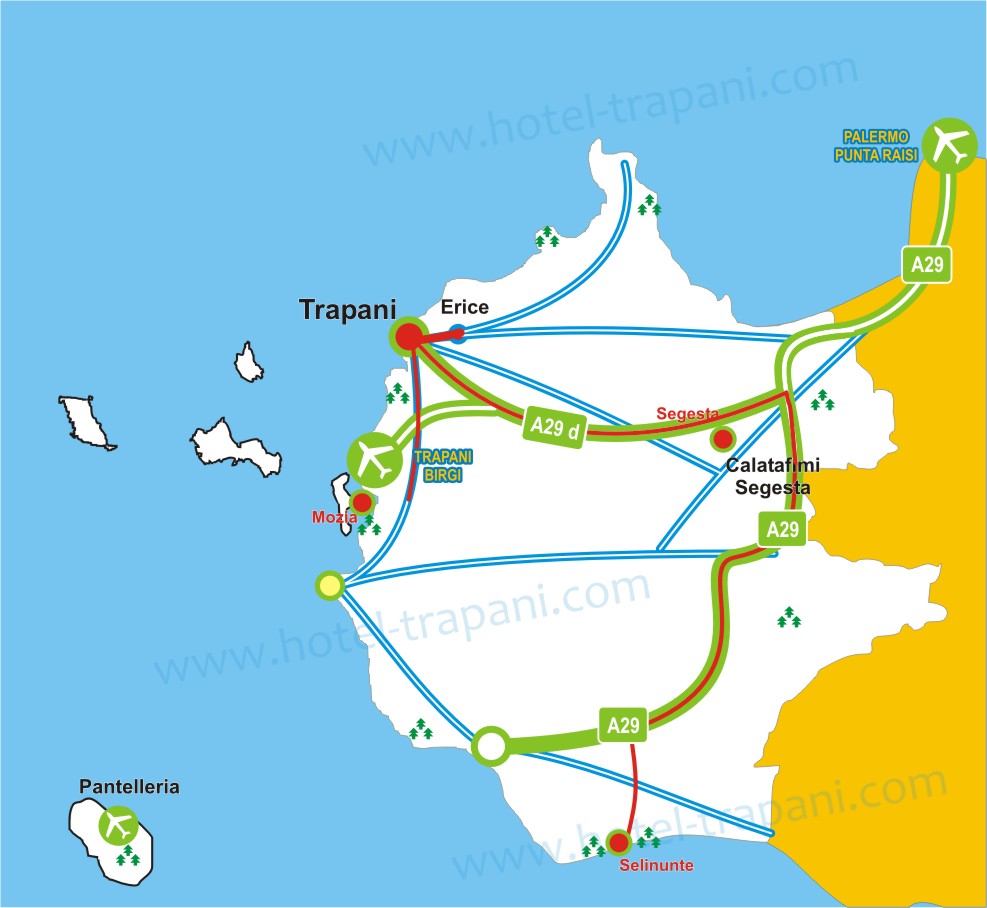 car (SP 31 road ) - Trapani-Mothia: by car ( SP 21road) (the salt road) - Trapani-Segesta: by car motorway A29 Segesta exit - Trapani-Selinunte: by car motorway A29 Castelvetrano exit then take the SS 115 road. |