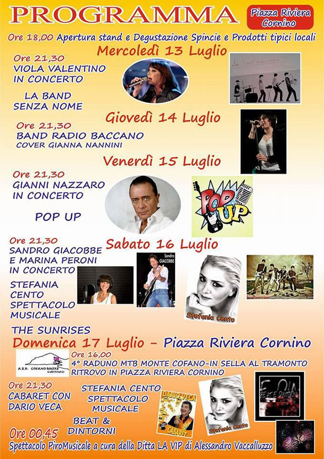 17 LUGLIO Ore 16,00: 4° raduno MTB MONTE COFANO-IN SELLA AL TRAMONTO Ritrovo dei partecipanti in piazza Riviera a Cornino, che è la sede di Spincia Fest. Ore 18,30: apertura stand e degustazione di spincie Ore 21,30: Cabaret con Dario Veca e a seguire spettacolo musicale con Stefania Cento. Ore 00,45: spettacolo piromusicale. Inoltre ci saranno i ragazzi di “Ti lascio una canzone”