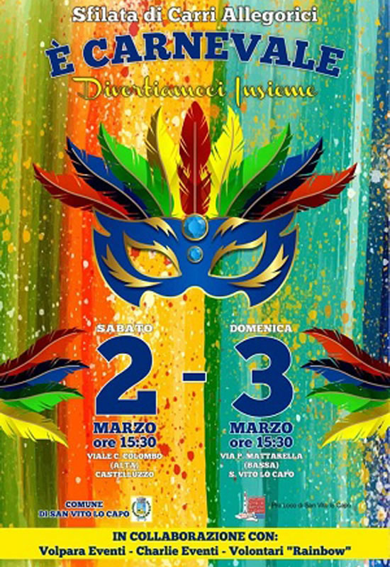 This year the festivities are divided into two parts, the first concerns the hamlet of Castelluzzo, where on Saturday 2 March there will be several masked groups organized by the "Dance Life" and "RitmoSfera Dance" recreational associations, while on Sunday 3 march in the city center of San Vito Lo Capo at 3.30 pm will take to the streets the allegorical wagons made by the members of "Volpara Eventi", "Charlie Eventi" and the Volunteers of the Rainbow Group.