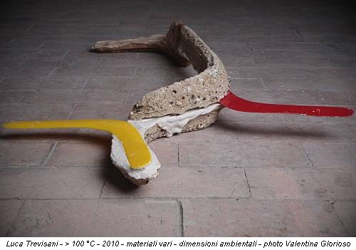 The Foundation Sambuca here marks a new stage in a series of artist residencies, who first saw the star, and then workshop Saccardi involved Trevisani, winner of the Premio Furla (2007) and the Premio New York (2009). Edited by Paul Falcone,> 100 ° C relates to the theme of water and fluidity, in close connection with the genius loci, not only in terms of collecting materials. The title itself refers to the temperature of boiling water, then the beginning of his disappearance. The forms may allude to an anchor, a boomerang, a sail: efficient tools in search of dynamic equilibrium with the wind, waves, sand. Tubular elements uprooted, wood chips, and their abstract shapes drawn in the negative plaster casts of empty ephemeral charged in informing the sand as if they were ancient bronze castings. Helga Marsala writes in the critical text that accompanies the exhibition: "The sculpture, then, as the living body. The way to breathe is his way of stumbling, inevitably, imperfect in its mutability, in its move towards a zero that is to meet information at the temporary, instantaneous. "In this archetype is consumed nullification risen to the oxymoron of an image that depicts the ethical imperative of the statement. It is a story not linear and not progressive, time experience of the disaster, to quote the words of Maurice Blanchot: "Concern for the least, the accidental sovereignty. The negative does not come after the claim (claim denied), but is related to what is the oldest "