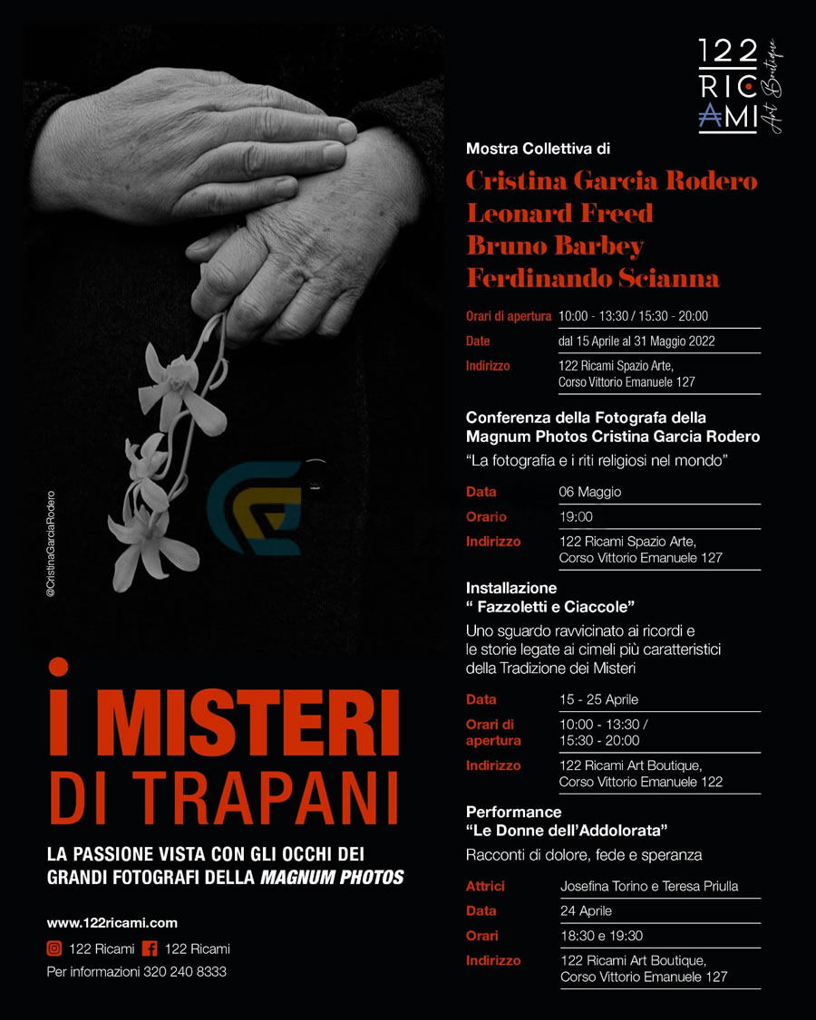 During the exhibition, on 6 May, again in the same location in the historic center, there will be a conference by Cristina Garcia Rodero entitled "Photography and religious rites in the world" even if the Procession of the Mysteries will have an important place in the story. , because the photographers of Magnum Photos have always been fascinated by the Trapani Good Friday Procession, which more than other rites manages to give unique and authentic emotions, since it is the only moment in which the whole Trapani community unites in a single story that is that of the Passion and Death of Jesus Christ.
