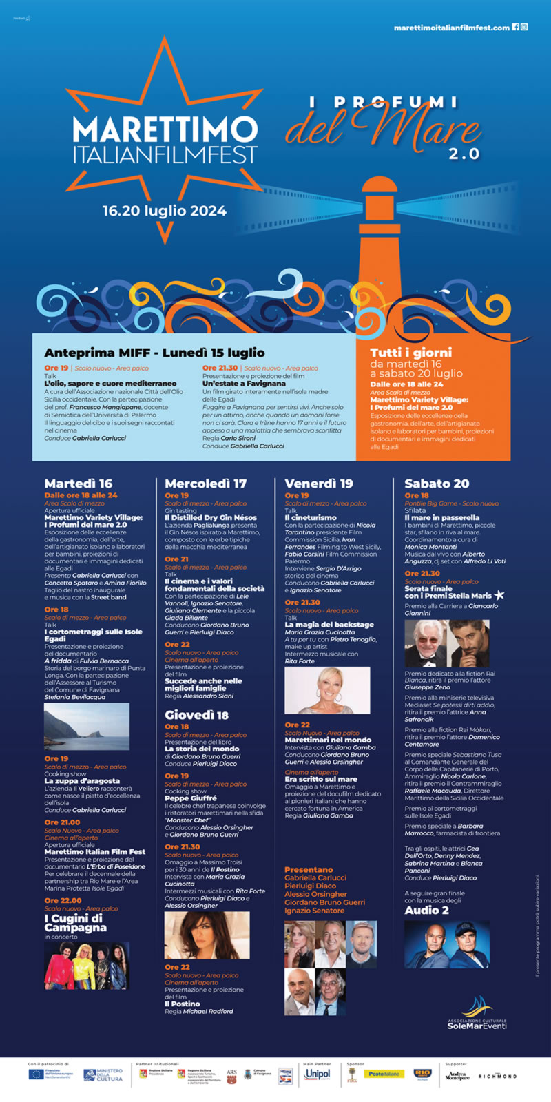 The festival will officially kick off on the afternoon of July 16th, with the screening of documentaries and images dedicated to the Egadi Islands; in particular, the documentary "LīErba di Poseidone" will be presented and screened to celebrate the tenth anniversary of the partnership between Rio Mare and the Marine Protected Area of the Egadi Islands. At 10.00 pm there will be space for music with I Cugini di Campagna in concert, on the specially set up stage at the Scalo Nuovo.
