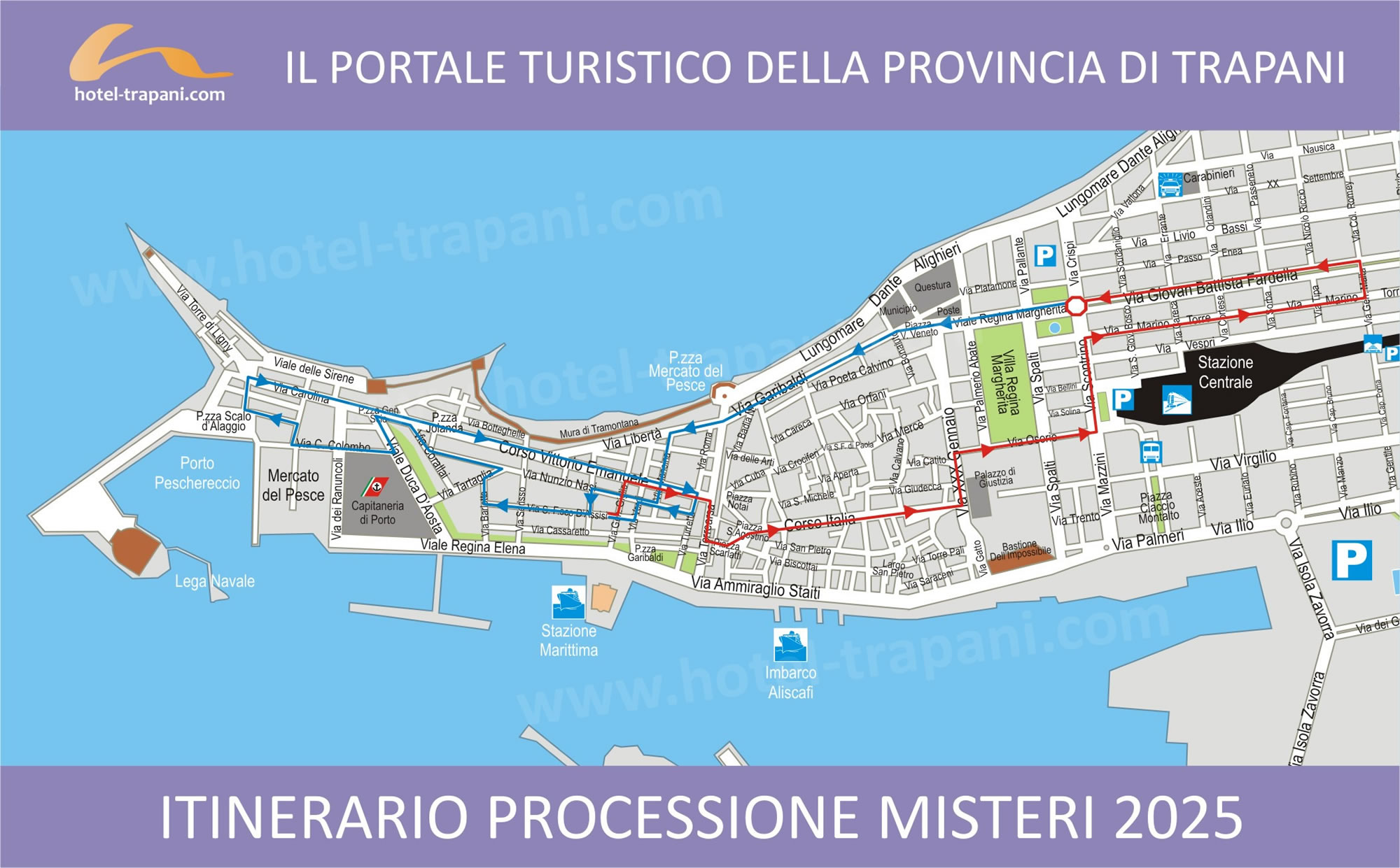 Piazza Vittorio Emanuele Viale Regina Margherita Piazza Vittorio Veneto Piazza Municipio Via Garibaldi Via Libertà Via Mancina Via Tintori Via Nunzio Nasi Via Generale Enrico Fardella Via San Francesco d’Assisi Via Barlotta Via Tartaglia Via Custonaci Via Corallai Corso Vittorio Emanuele Viale Duca d’Aosta Via Cristoforo Colombo Via Giovanni da Procida Via Silva Via dei Piloti Largo delle Ninfe Via Carolina Piazza Generale Scio Corso Vittorio Emanuele Via Turretta Via Nunzio Nasi Via Giuseppe Verdi Via San Francesco d’Assisi Piazza Purgatorio Chiesa Anime Sante del Purgatorio