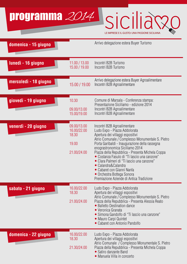 The 6th edition of " Siciliamo " will be presented by the President of the Chamber of Commerce and Mayor Joseph Pace Julia Adam in the Town of Marsala, Thursday, June 19 at 10:30 . The food and wine event of the event , however , given its scope , will have a presentation of its own, which will be held Friday, June 20 at 19 o´clock, with the traditional ribbon-cutting ceremony from Porta Garibaldi . A square of Sorrows also start the " Ludo Expo" , the village of entertainment for children. At 21 , Piazza della Repubblica, Michela Coppa present the first of three evenings of entertainment program . On stage will perform Calandra & Calandra, Clara Palmeri of " leave you a song " and the orchestra "Bottega sound ." There is also space at the cabaret with Gianni Nanfitò . In the course of the evening will be rewarded companies with an ancient tradition .