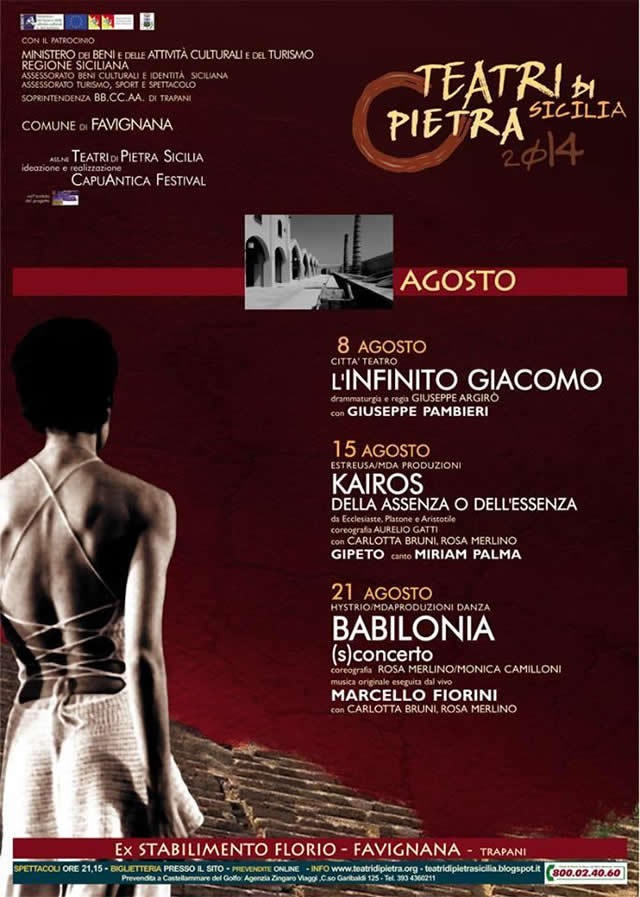 Within the project, including several appointments Florio former factory of Favignana. On August 8, produced by "City Theatre", will be staged "The infinite Giacomo Giuseppe Argiro who will direct the drama with the participation of Giuseppe Pambieri On August 15, it will be the turn of "KAIROS - or the absence of the essence," a work of Ecclesiastes, Plato and Aristotle choreographed by Aurelio Gatti It will close on August 21 with "BABYLON - (s) concert" with original music performed live.