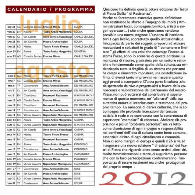 The province of Trapani is no exception and participates as a leader among the representations organized in Sicily. In fact, despite the endemic shortage of funds that this year has affected the event, at the end of the program has been compiled albeit with difficulty. The province of Trapani will be featuring the archaeological area of Selinunte August 8, with the representation "Del Minotauro", on August 11 with "The Labors of Hercules", August 18 will be the turn of "Pseudolo," the opera "ion" will be staged on 27 to close finally, August 31 with "Hecuba."