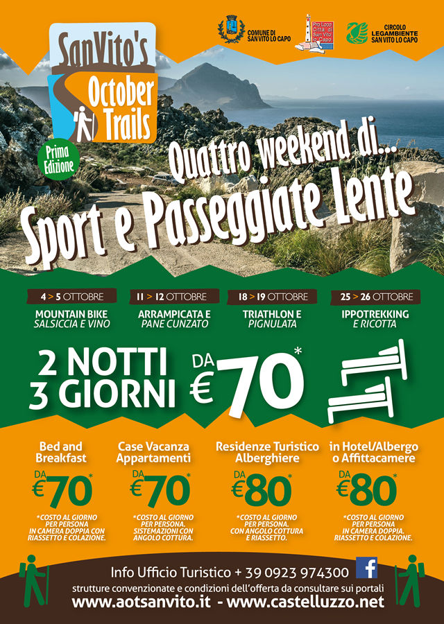 A unique opportunity to spend, for four weekends, days of sport and healthy walks, all to rediscover the great trails and landscapes of San Vito lo Capo. Mountan Bike, arrampiacata, triathlon and ippotrekking, will be the protagonists of the event from October 4 until day 26, departing from the tourist office in Via Savoia, accompany curious and passionate. Not only sports, but also tasting of typical local products, such as the "bread cunzato", the "pignulata", the sausage, the "sfinci" and ricotta (via Venza), and evening shows that will be held instead on stage in Piazza Santuario.
