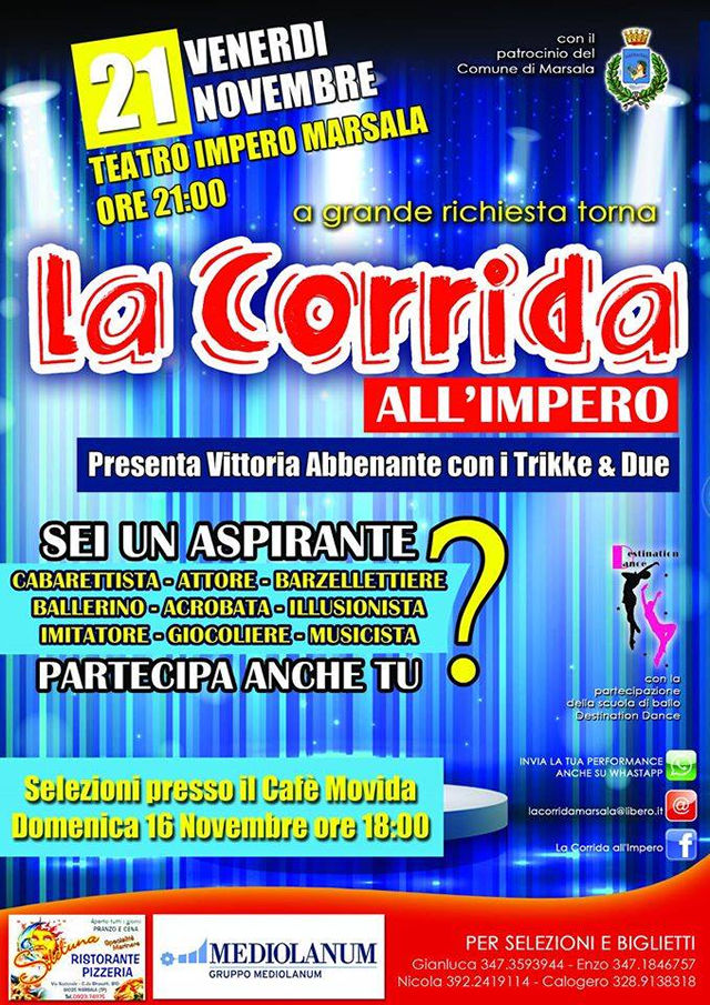 So many requests for participation, with selections that will be held Sunday, November 16, at 18, at Café Movida (via Mazara Petrosino. Near the Hotel Baglio Basile). Those who consider themselves "amateurs" may have to book; the selections are of course also open to talented singers, dancers, comedians, acrobats, poets.