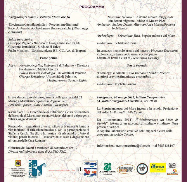 Recall that the event will have its epilogue March 21, 2015 in Marettimo with the enhancement of the site "Roman Houses", and is also promoted and sponsored by the town of Favignana and with the collaboration of the town of Erice, City of Peace and for the Science, Superintendency BBCCAA of Trapani, including "A.Rallo" Egadi, the Marine Protected Egadi Islands and several associations that have announced their support: Legambiente Egadi, the section of Trapani FIAB, the foundation EriceArte, the coop color and Radio FML.