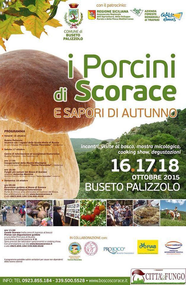 October 18, 2015: - 9:00 am Guided hike to the forest Scorace. Route mycological - naturalistic (point: picnic area at the entrance of Bosco reservation on the site w ww.boscoscorace.it or by telephone at 0923 ° 855184-3395005528). - 13:00 Scorace Casale (in the entrance area to the Bosco) lunch-tasting organized by the pro-site of Buseto Palizzolo.