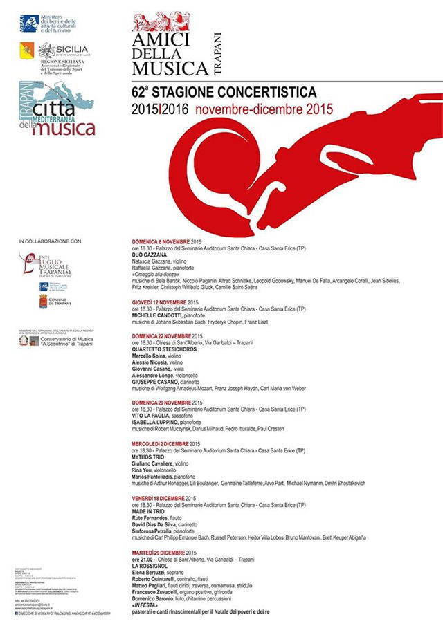 The curtain rises on the 62nd Concert Season 2015/2016 organized by the "Friends of Music" of Trapani with the assistance of the Ministry of Heritage and Culture and Tourism and the Region of Sicily - Regional Ministry of Tourism, Sport and the Entertainment and in collaboration with the Ente Luglio Musicale Trapanese - Theatre of Tradition and the "A. Receipt "of Trapani.