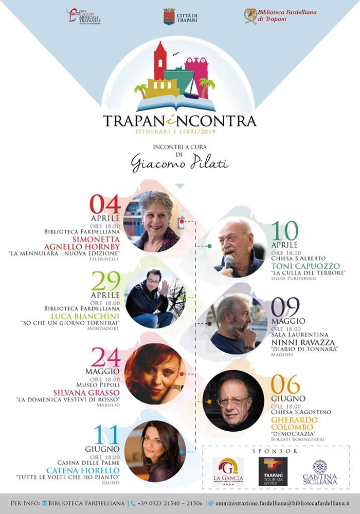 C’è un grande appuntamento con la cultura la letteratura in programma a Trapani dal 4 aprile all’11 giugno, che vedrà come protagonisti 6 meravigliosi luoghi della nostra città che saranno le location degli incontri letterari con l’autore per la presentazione della loro ultima fatica letteraria.