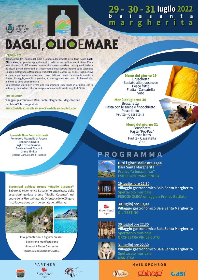 Ritorna la manifestazione più originale e gustosa nel campo della gastronomia locale ovvero “Bagli, Olio e Mare” in programma nella suggestiva location di Baia Santa Margherita a Castelluzzo, a pochi chilometri di San Vito Lo Capo.