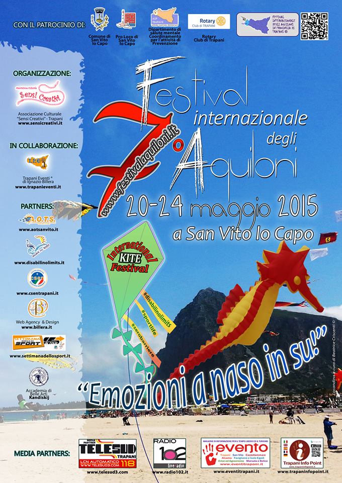 Anche quest’anno si svolgerà l’atteso appuntamento del Festival degli aquiloni che ci tiene con il naso in su, giunto alla sua settima edizione. Come sempre sarà il rinomato borgo turistico di San Vito Lo Capo la location di una manifestazione, partita quasi in sordina nel 2009, ma che è diventata un evento con cui San Vito Lo Capo apre la sua lunga stagione turistica.