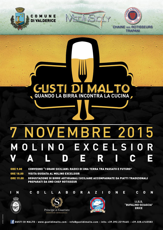 Ecco perché, da un´idea della Chaine des Rotisseurs di Trapani e frutto del lavoro organizzativo dell´Associazione MedInSicily, il 7 novembre, al Molino Excelsior di Valderice (TP), si festeggerà la bevanda schiumosa più famosa al mondo, sottolineandone anche lo splendido connubio tra essa ed il cibo, con l´evento “GUSTI DI MALTO”, patrocinato dal Comune di Valderice.